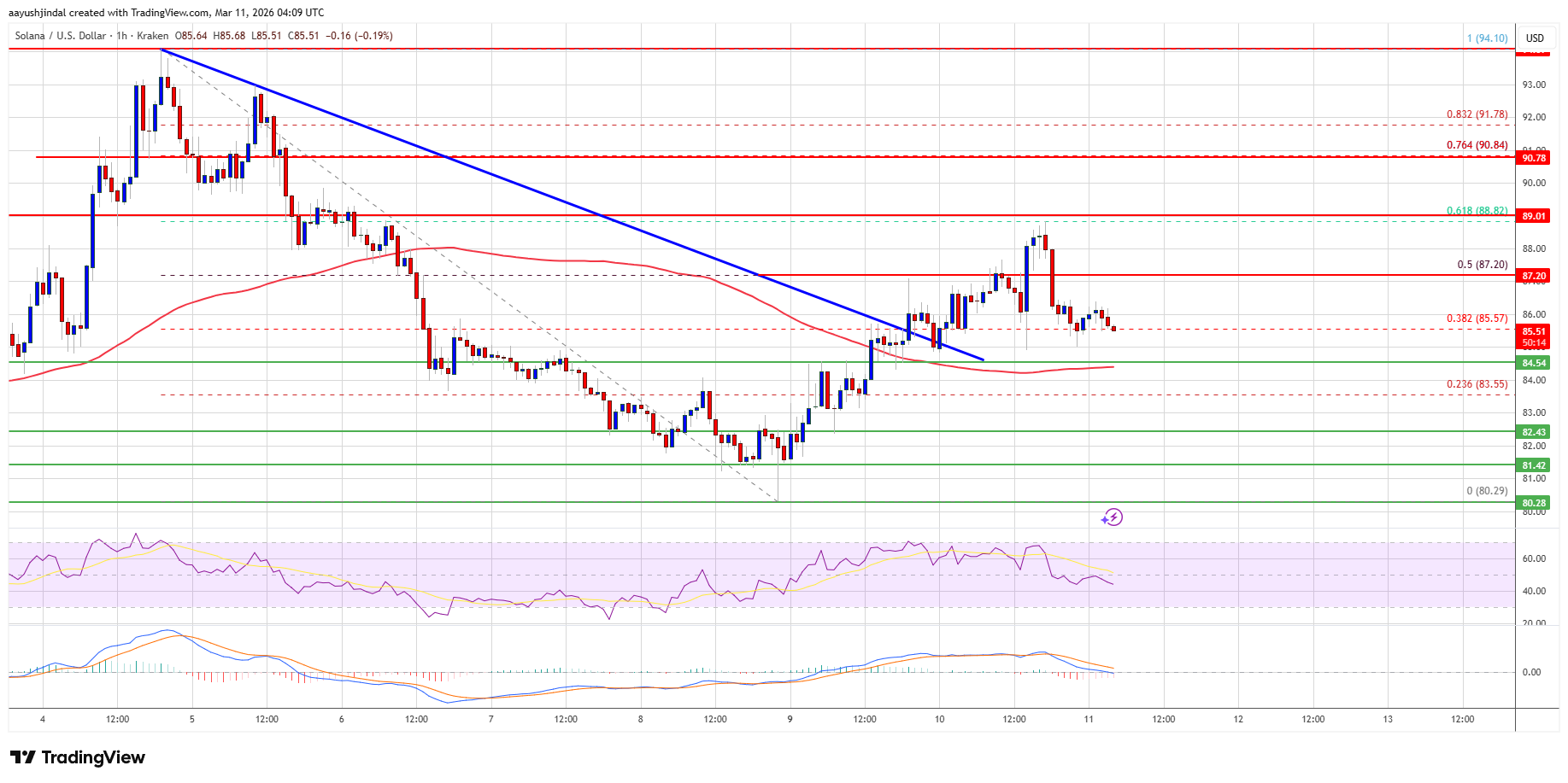 If SOL fails to rise above the $88.80 resistance, it could continue to move down. Initial support on the downside is near the $84.50 zone. The first major support is near the $82.50 level.